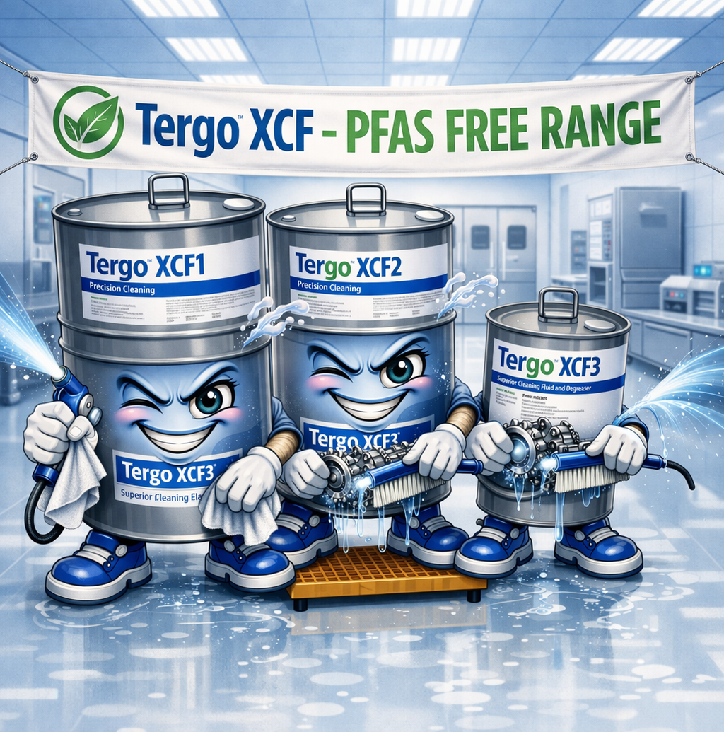 Tergo™ XCF range of PFAS-free products. Designed to replace HFEs, HFCs and other PFAS containing solvents in cleaning, degreasing and flushing applications. The answer to your long-term component cleaning needs